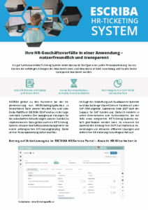 Das HR-Ticketing-System von ESCRIBA optimiert die Bearbeitung von Mitarbeiteranfragen durch standardisierte und (teil-)automatisierte Prozesse. Es integriert sich nahtlos in SAP HCM, SuccessFactors und Workday, reduziert Durchlaufzeiten und senkt Lizenzkosten. Als zukunftssichere Alternative ersetzt es das auslaufende SAP CRM Shared Service Framework.